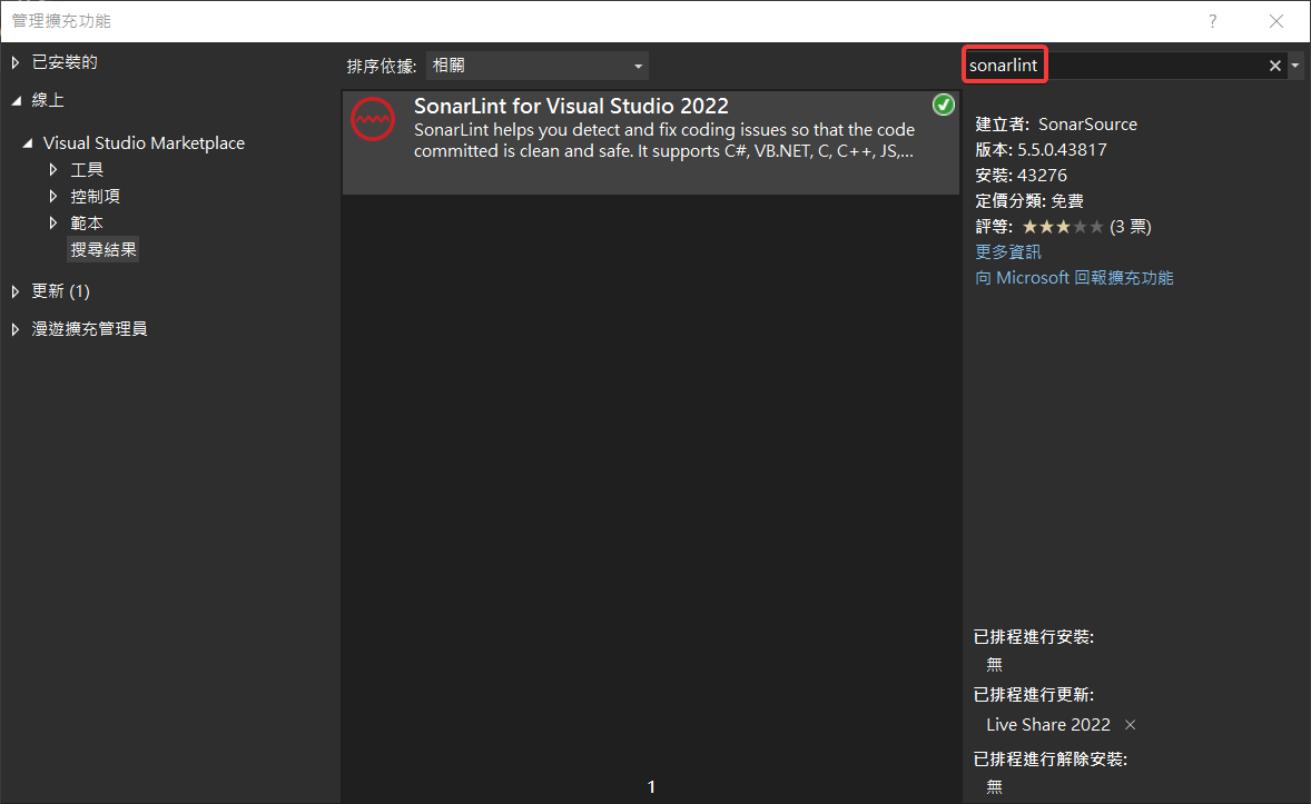 安裝的方式直接從 Visual Studio 使用 延伸模組 進行安裝,搜尋「sonarlint」並安裝,完成後重新啟動 Visual Studio。