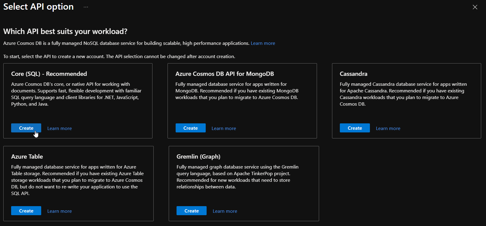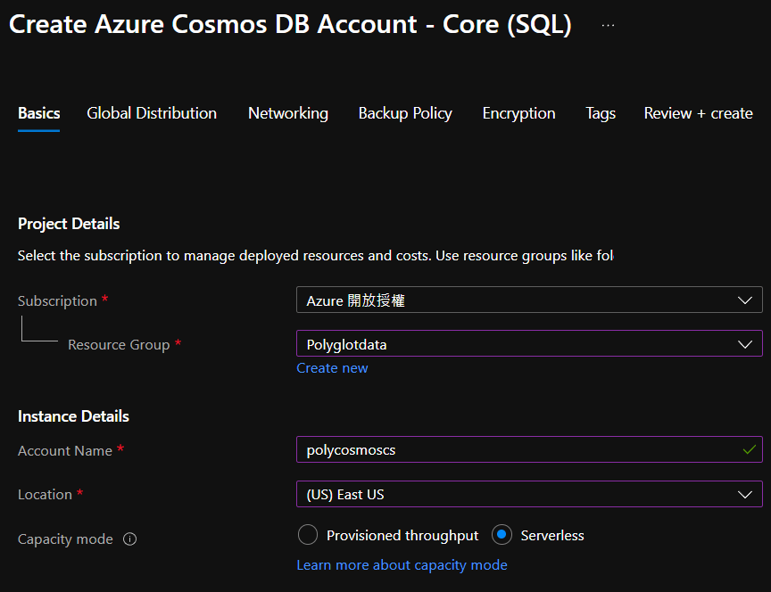 建立 Comsmos DB Account,類型選擇「Core(SQL)」,其他還有 Azure Cosmos DB API For Mango DB、Cassandra、Azure Table 以及 Gremlin 可以使用的類型。