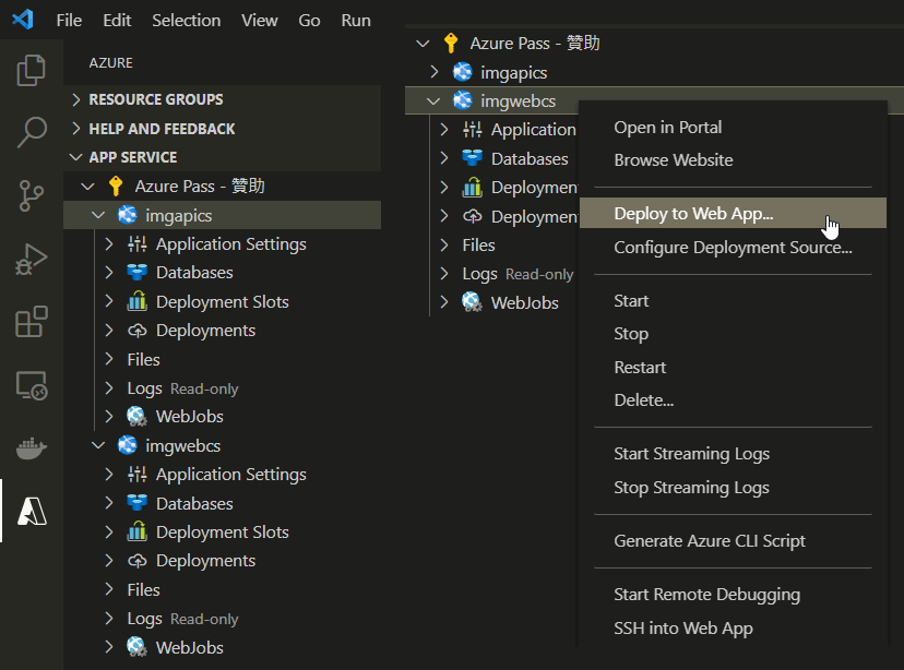除了使用 az cli 進行部署作業外,也可以從 Visual Studio Code 安裝 Azure App Service Extensions 來進行部署作業。