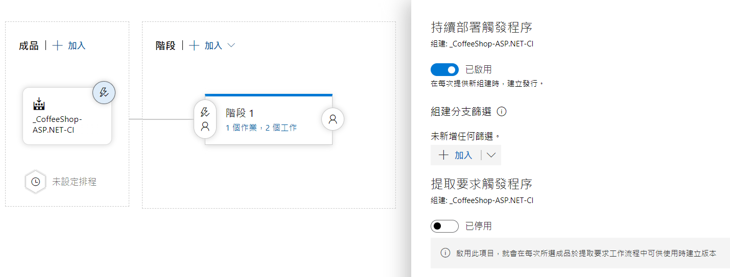 接著到 CD Pipeline 進行設定,將部署的階段調整為持續部署觸發程序