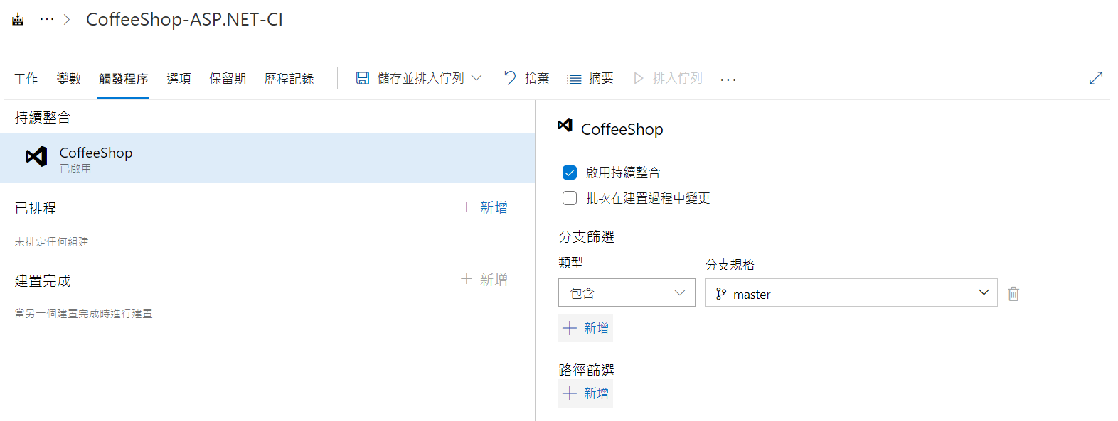 首先到 CI Pipeline 進行設定,啟用持續整合的設定