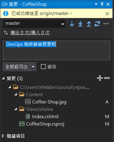 接著馬上來驗證 CI & CD 是否已經自動化,使用 Visual Studio 進行程式碼設計,並將結果 Commit 到 DevOps Server: