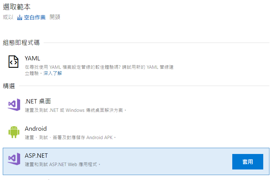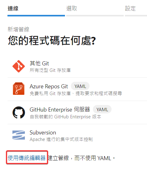 目前主流的開發方式都是使用 YAML 來設計 Pipeline 以達到 Infra As Code,但筆者目前對於使用 YAML 來設計 Pipeline 完全沒有相關經驗,因此這次的示範是以「傳統編輯器」的方式來設計 Pipeline。