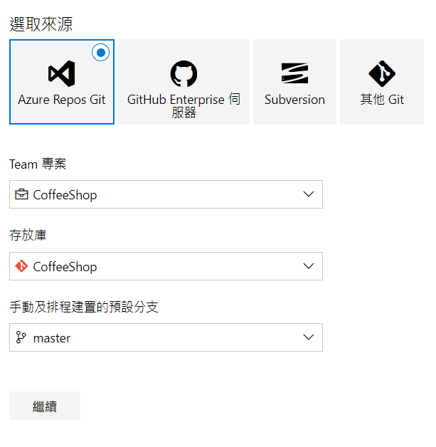 資料來源因為是使用版控在 Azure DevOps 上的 Repos 所以就是 Azure Repos Git