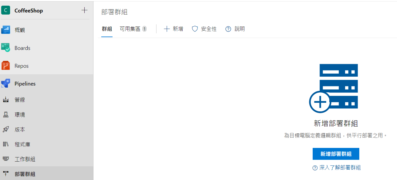 從專案選擇「部署群組 (Deployment groups)」用以建立部署目標伺服器,例如 IIS Server。