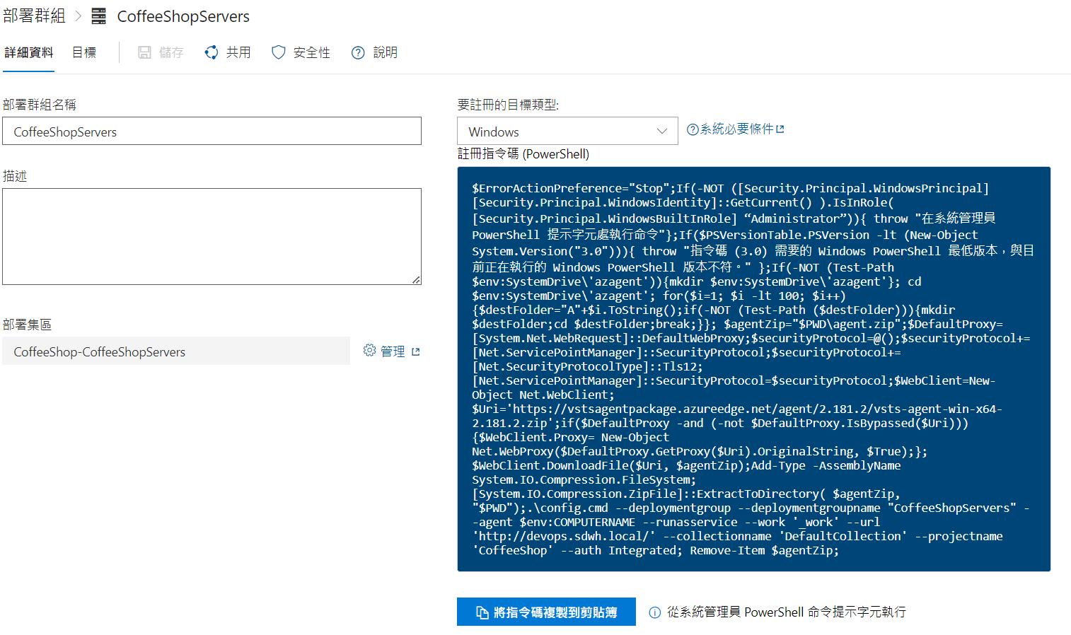 只要將 DevOps 上提供的 PowerShell Script 複製到 Target Server 上執行即可 (執行須使用 Administrator 身分並且只有用 PowerShell 不能用 PowerShell ISE)。過程中會需要確認以什麼樣的服務權限來讓 DevOps 進行部署使用,預設是 NT Authority\SYSTEM。