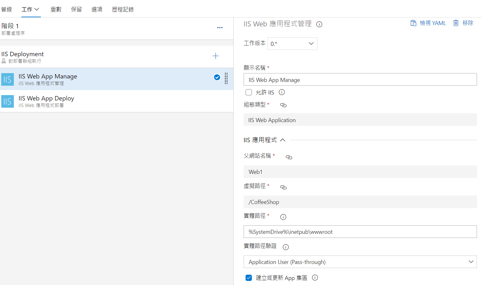 需要注意的是在 Web App Deploy 一定要設定虛擬應用程式的位址,而且必須與 Web App Manage 的虛擬路徑相同,否則會造成 DevOps Deploy 的檔案無法建立成功,但 CD 管線卻正常完成的 Bug (耗費 2 個小時 Debug 的心淚) 😥