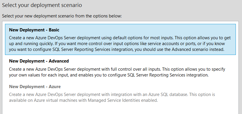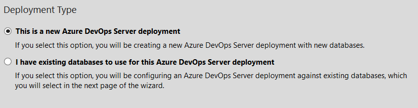如果是恢復或者升級 Azure DevOps,可以選擇既有的資料庫,否則選擇建立新的 DevOps Server Deployment。