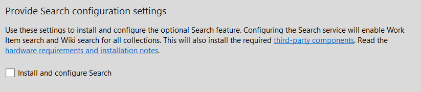 在搜尋選項,可以設定是否要啟動 Collection 層級的搜尋功能,可以用於搜尋 Work Item 以及 Wiki 內容,非常方便,但本次示範為簡化不特別進行設定。