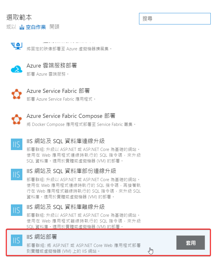 範本選擇「IIS 網站部署」,其他幾個選項都很相似,所以在部署上需要有相當的 IIS、Azure 管理經驗,才能夠將原本的部署作業方式轉換為 Infra As Code 的部署管線方式。