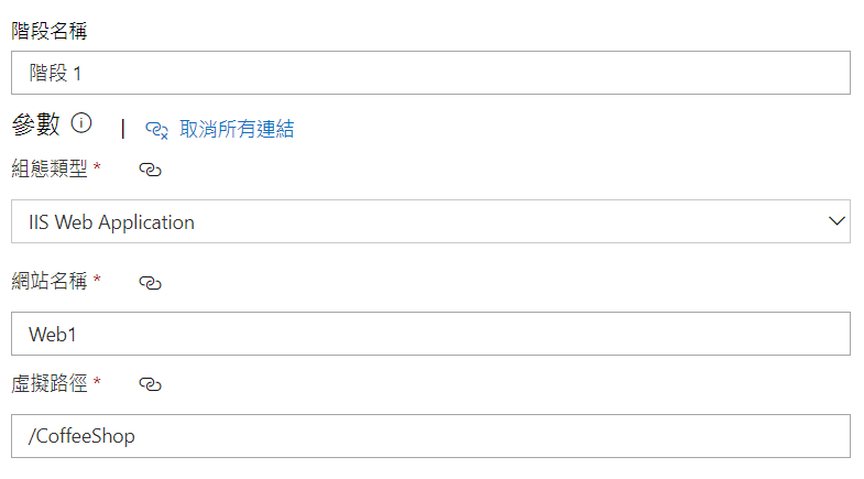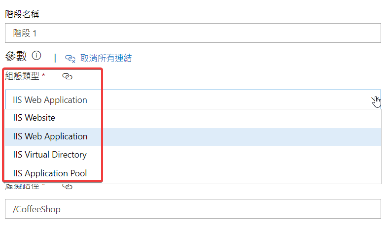 在階段的組態類型,要注意需要建立的是 IIS 站台、Application 或者是虛擬目錄,這個地方很容易因為選錯卡關,具體的差異需要有使用 IIS 的經驗。