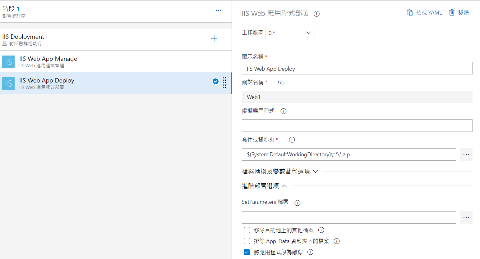接著設定 IIS Web App Deploy,這邊可以設定部署是否先將程式離線、刪除已存在檔案等設定對應於以往使用 Visual Studio 發佈到 IIS Server 上的相關設定:
