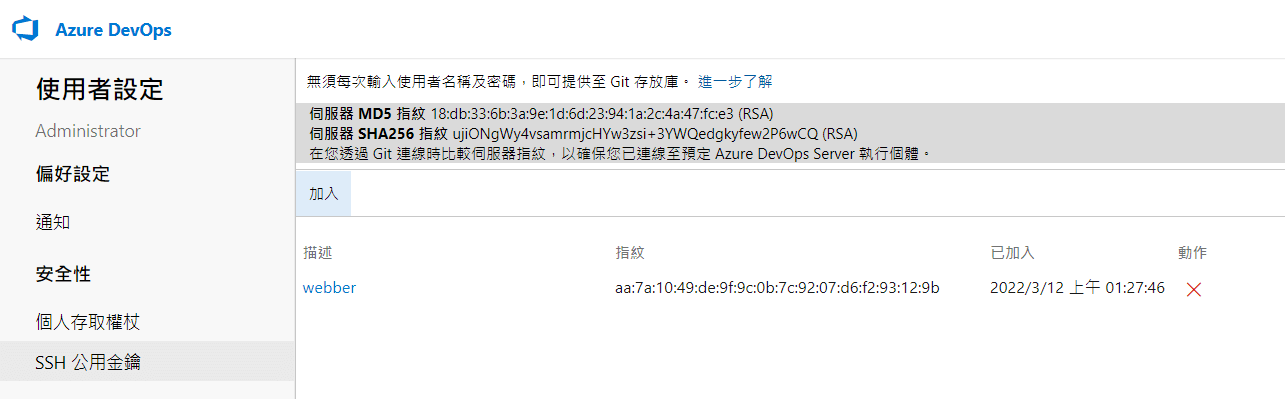 接著將 id_ras.pub 的內容複製後,到 Azure DevOps 使用者的 SSH 設定加入: