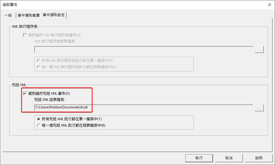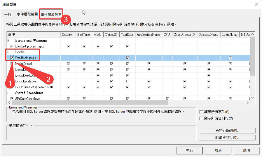 特別的是為了要啟用事件擷取設定,必須要取消勾選 Deadlock graph 後再重新勾取才會出現 😅