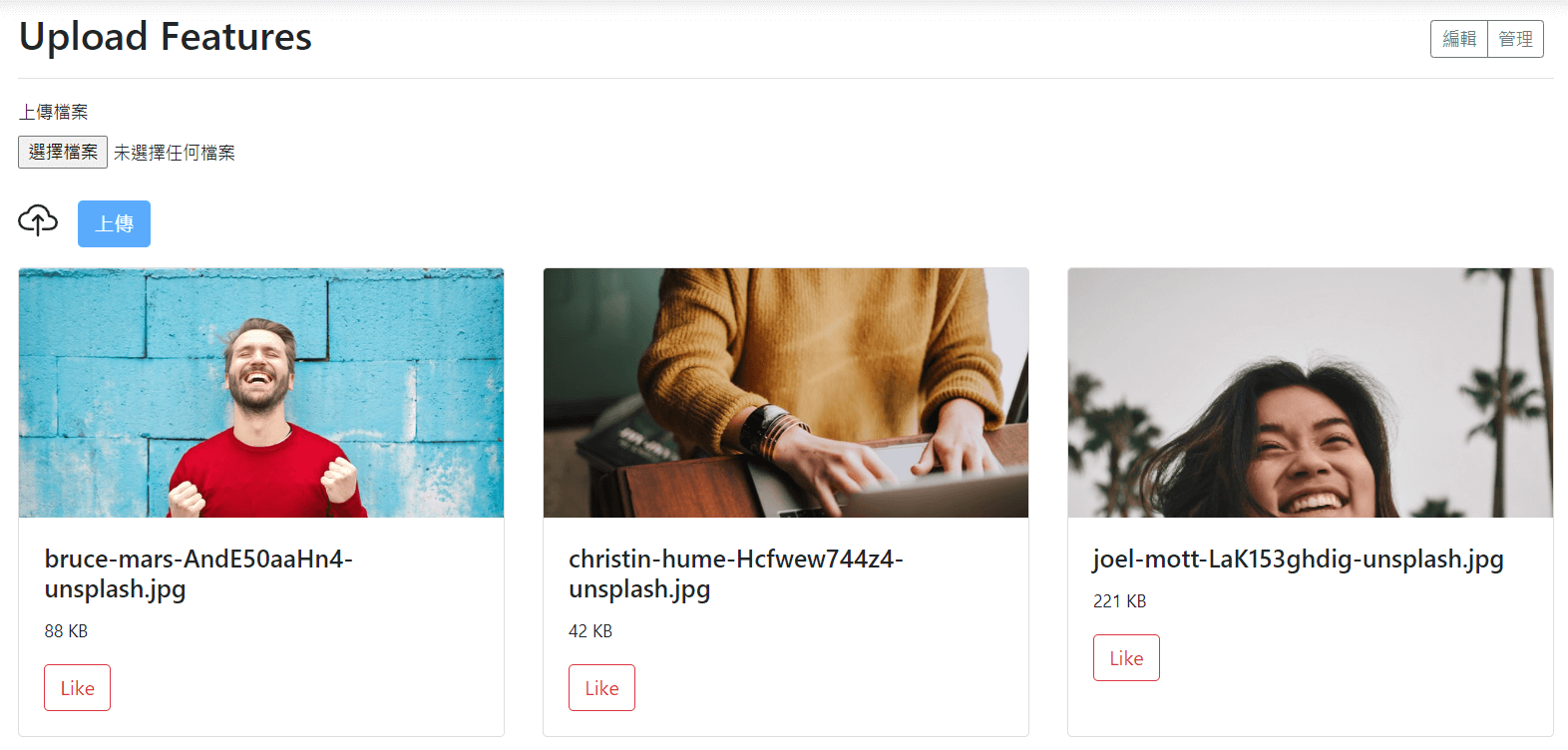 預設上使用者沒有選擇任何檔案也可以看上傳,雖然在後端 Action 有進行檢查,但在前端能夠防呆會讓使用者體驗更好,所以在 Upload 的 Submit Button 啟用 Disabled 屬性,並且使用 jQuery 偵測選擇上傳的檔案數合理時,才主動移除 Disabled 屬性。