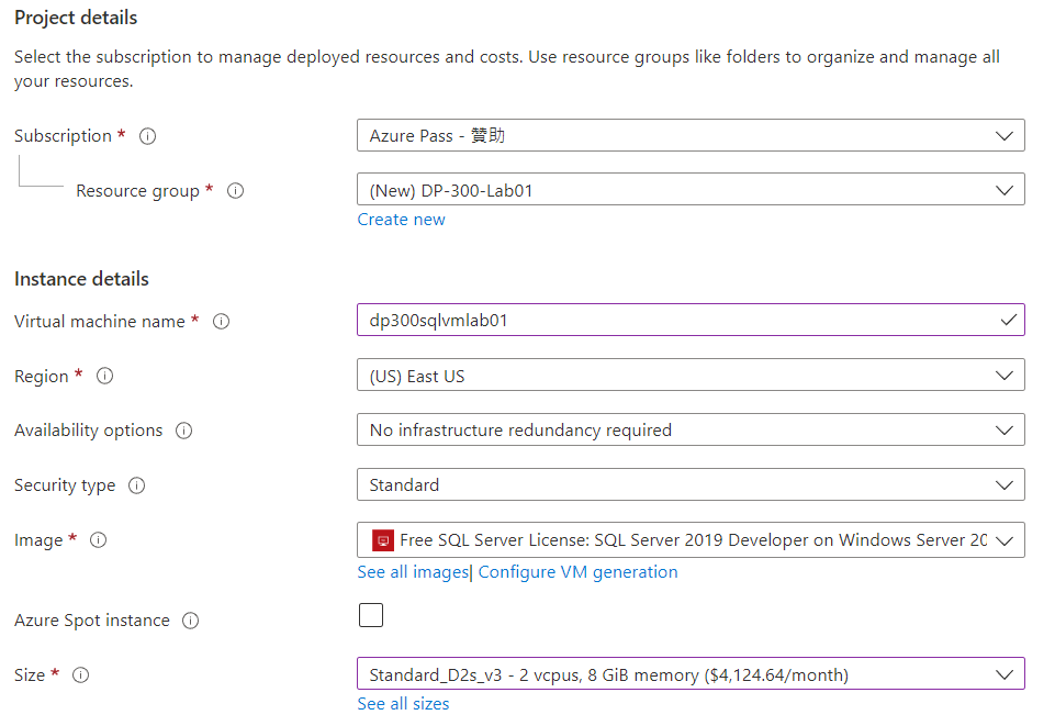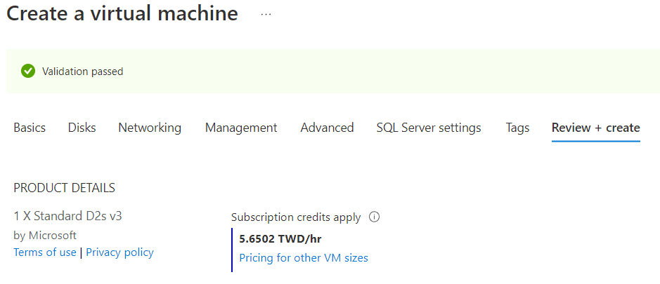本次實驗是使用 D2s v3 規格等級的虛擬機,因為使用 SQL Server Developer 版本,沒有額外的 SQL Server 授權費用,因此成本集中在虛擬機本身。大家從圖片中可以看到每小時約 5.6 元新台幣,實驗結束可要儘速將資源刪除,否則就像是開著的水龍頭,一點一滴會讓你的荷包流光 😫