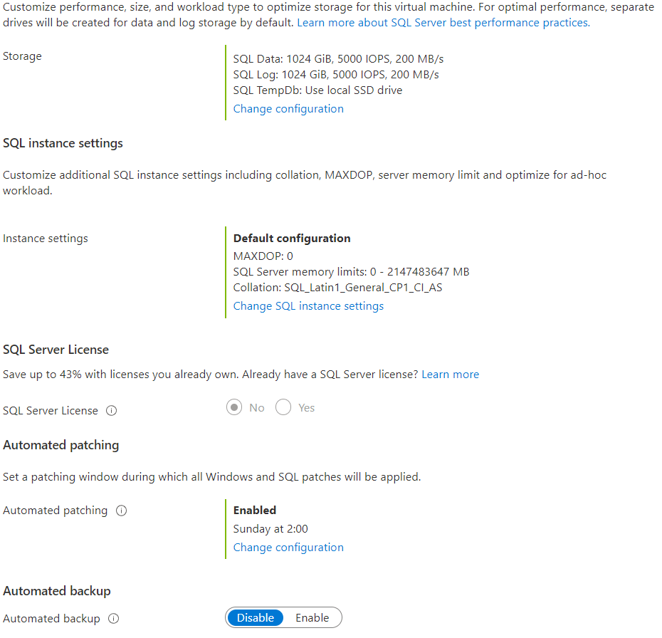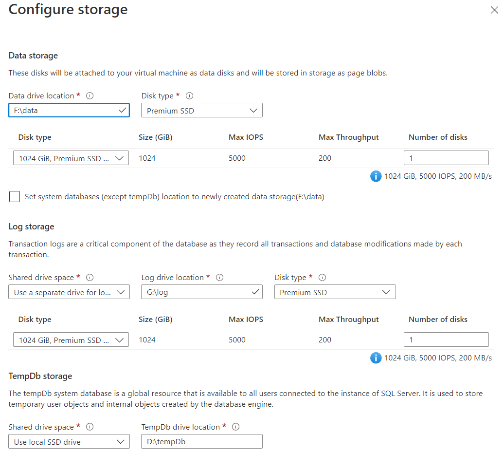 我們可以對於 Storage 進行更詳細的設定,包括指定 Disk Size 以及 tempdb、data 還有 log 分別要放在那些 Disk Path。