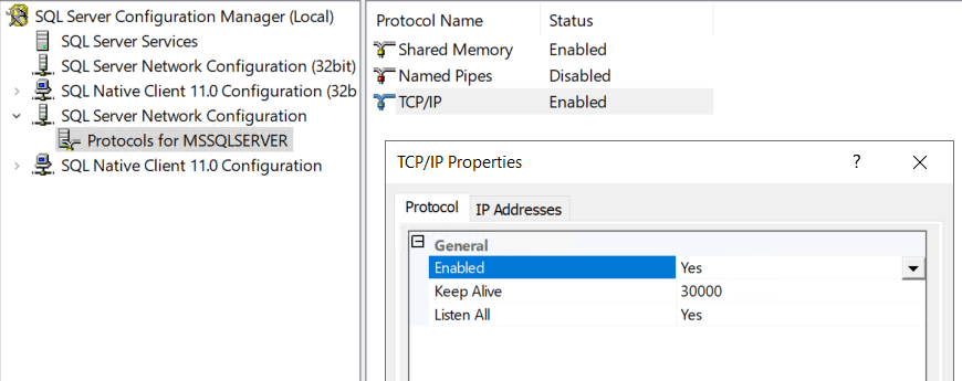Protocols 則是開啟了 Shared Memory 以及 TCP/IP,很好,方便我們待會可以試驗遠端使用 SSMS 以 TCP/IP 的方式進行連線。
