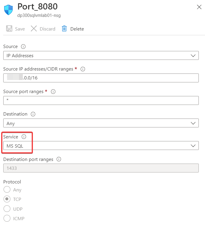 一切順利之後,接著是要從本機使用 SSMS 連線至 Azure VM 的 SQL Server。該怎麼進行呢?關鍵的步驟是到 Azure Portal 對 VM 設定 Networking 允許本機的網際網路 IP 可以經 1433 Port 連線至 Azure VM 當中。