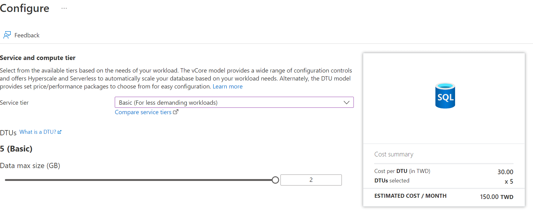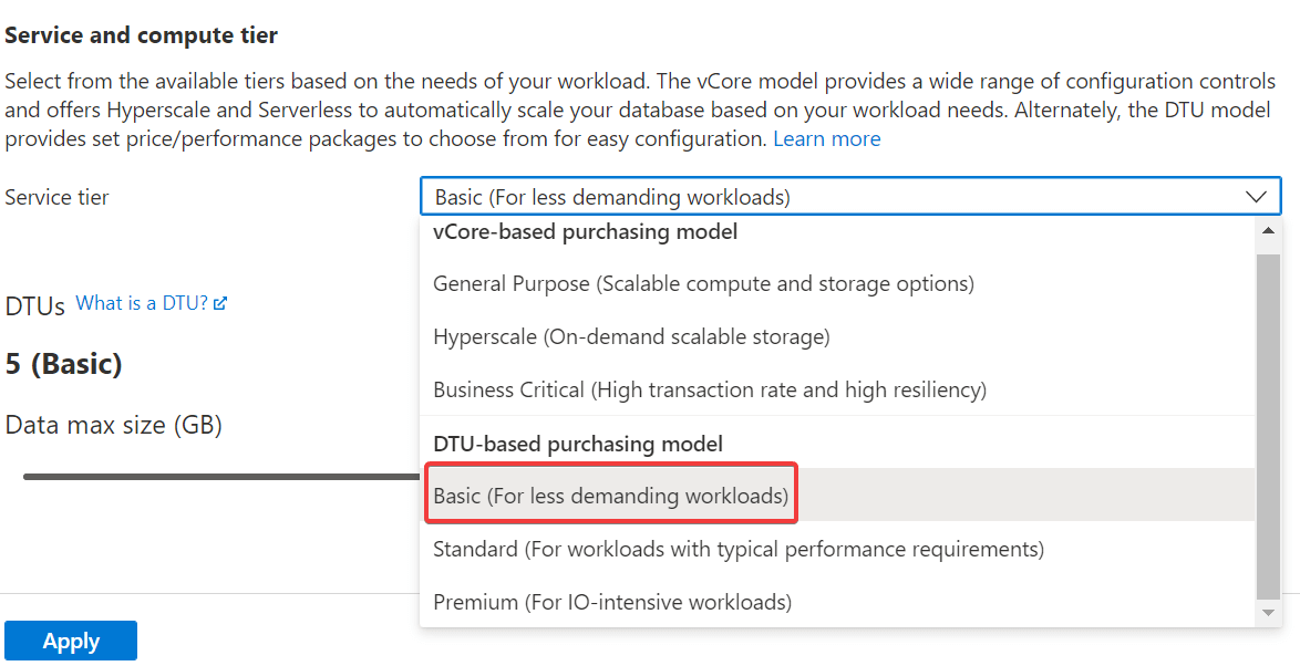 | Compute + Storage | SQL Database 實際的資源等級,包含運算資源以及儲存資源 |