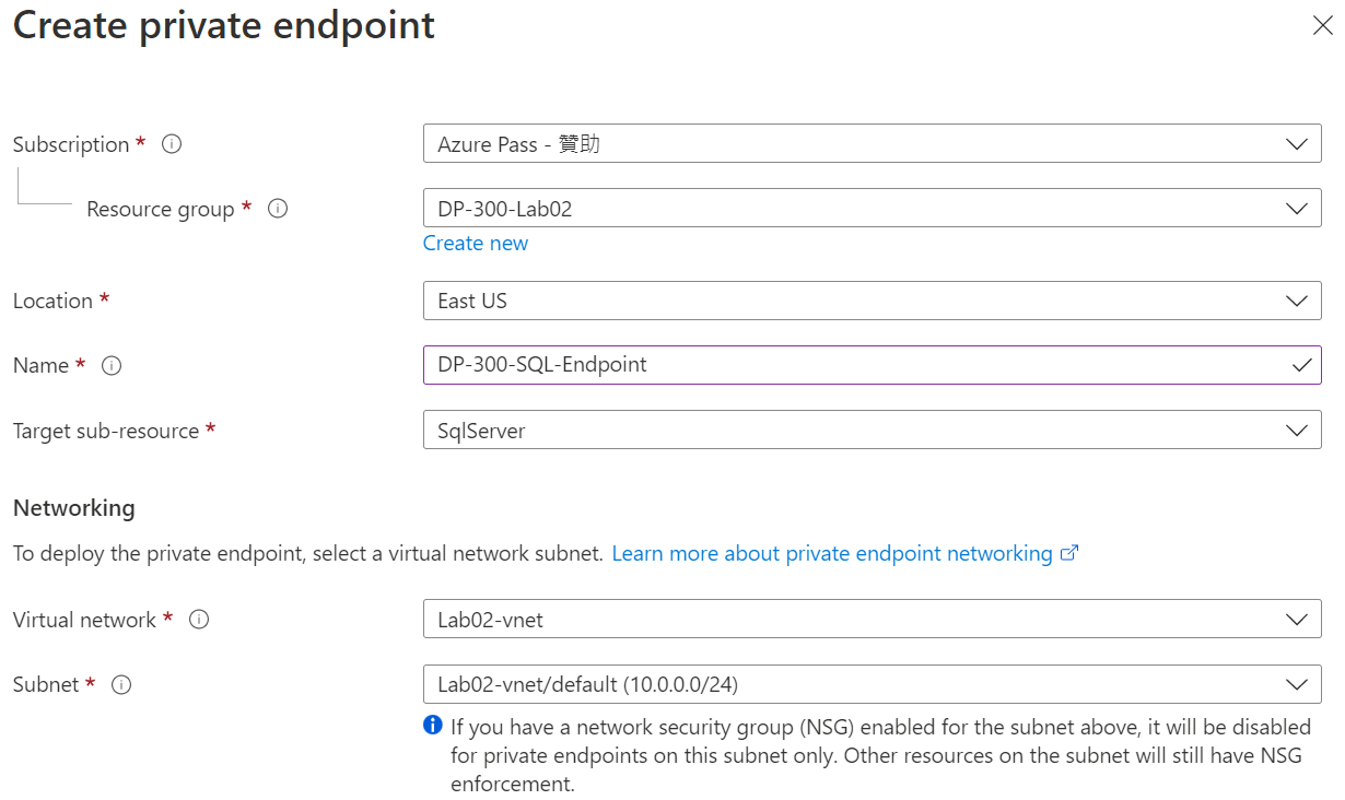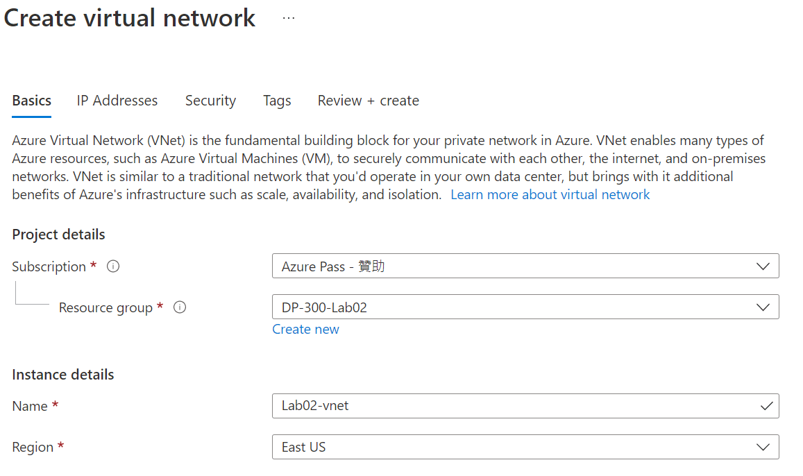建立資源群組 DP-300-Lab02 後建立 Virtual Network