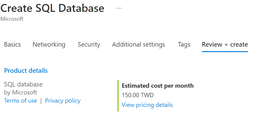 接著設定 Compute + Storage,這邊我們選擇的是「DTU-based purchasing model」每個月約 150 元,如果使用「vCore-based purchasing model」動輒每個月最少要 10,000 元以上 😥