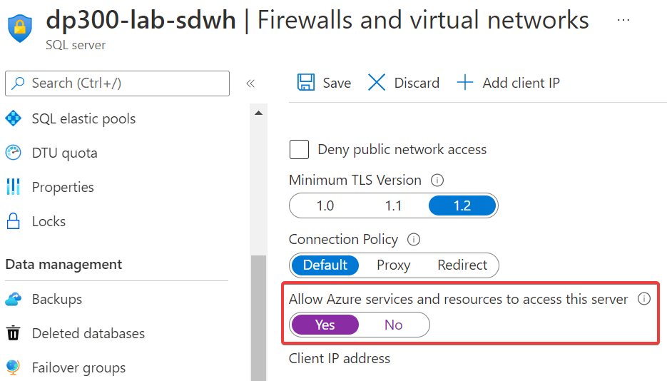 從 Firewall and virtual networks 啟用 Allow Azure services and resources to access this server。