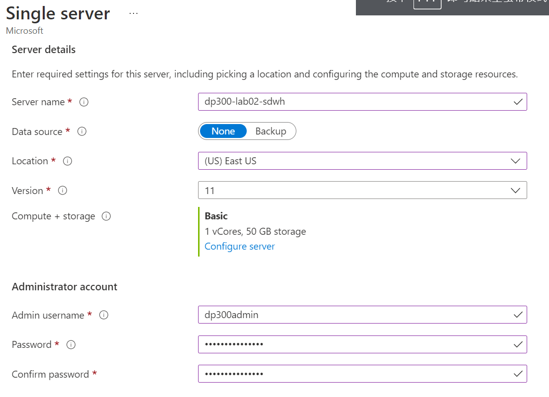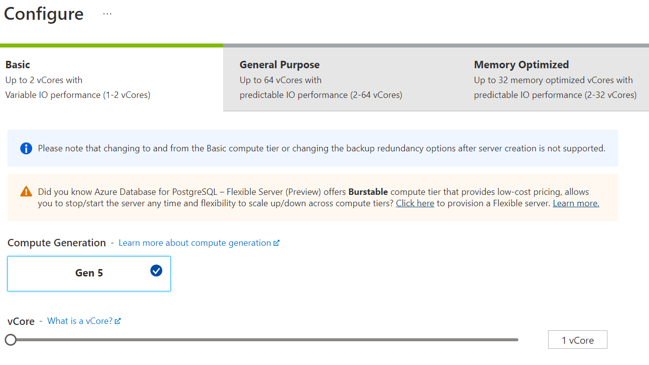 我們將 Server 的規格選擇最低階的 Basic Gen 5 並且只有 1 個 vCore。