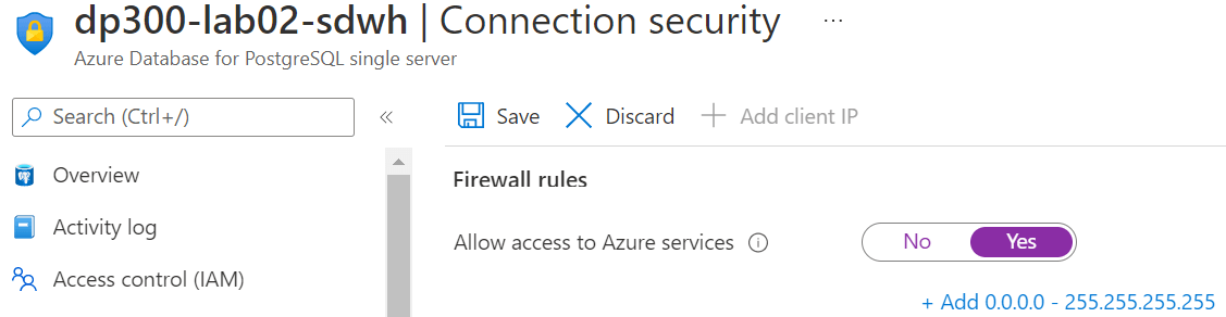 資源建立完成後,接著到 Resource Group 找到 PostgreSQL 設定 Connection security,除了加入 Client IP 外,也啟用 Allow access to Azure services