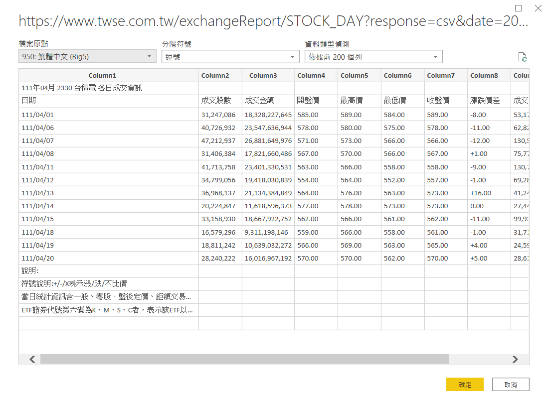 本次示範使用證交所的 個股日成交資訊,提供了使用 URL 搭配股價代號以及交易日期的方式取得 CSV 檔案。