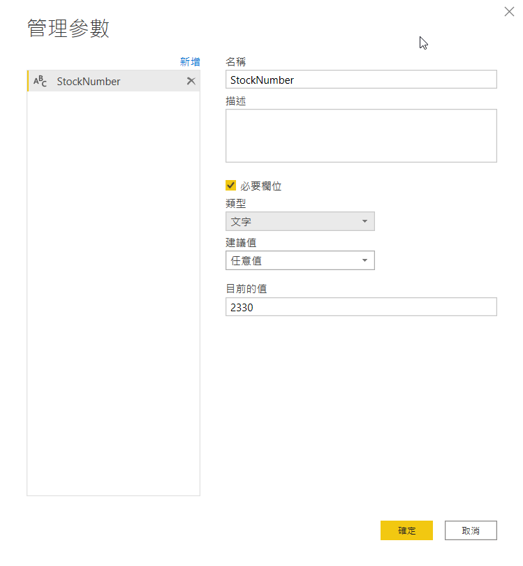 參數輸入下列下關資訊,其中資料類型要選擇為 文字。