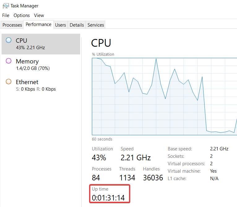 使用工作管理員,從效能頁籤選擇CPU進行確認,可以看到距離開機到現在已經過了多久 (Up time),資料欄位意義為 日:時:分:秒