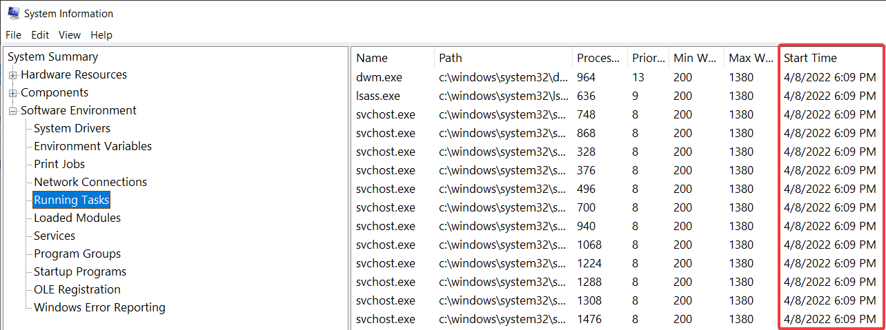 使用 Windows Run 執行 msinfo32,開啟速度快,但需要依序點選軟體環境再找到執行工作,接著排序日期由最早開啟的 Task 推算開機日期。