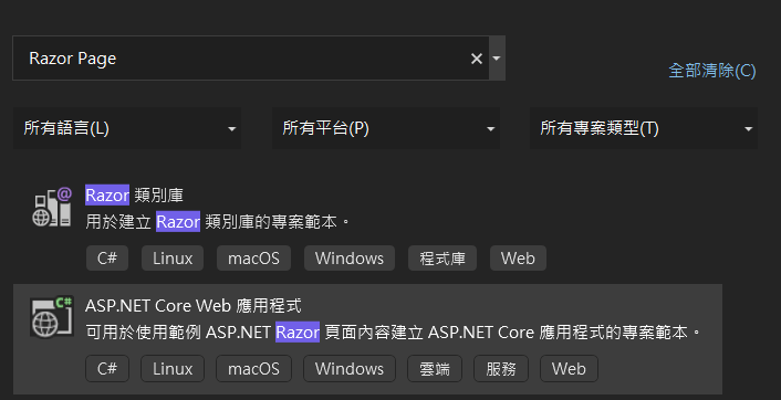 Visual Studio 中的專案選擇很容易讓人迷惑,Razor Pages 專案就是 「ASP.NET Core Web 應用程式」 😅