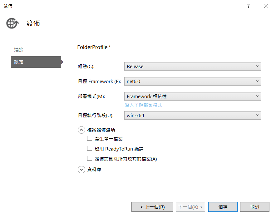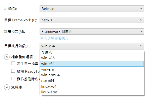 目標執行階段 (Runtime),選擇很多元,但選擇符合本次案例要進行的平台 win-x64
