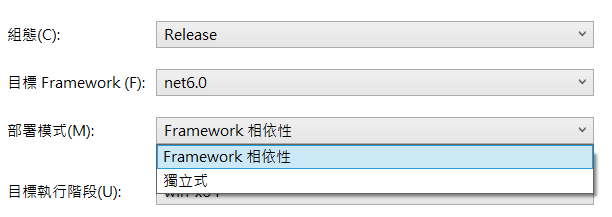 部署模式的選擇,包含 Framework Dependency 以及 Standalone。
