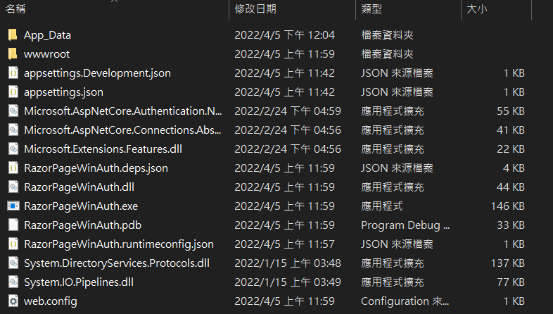 而在 .NET Core 則是由 Program.cs 搭配 AddNegotiate 的方式來達成,但啟用 IIS 中 Windows Auth 的步驟仍不可少。