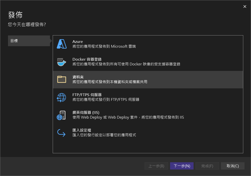 編譯專案無誤後,直接部署至 IIS Server,這邊選擇採用部署至資料夾的方式,以 Share Folder UNC 的方式,從 Dev Client 部署至 IIS Server。