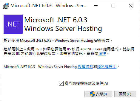 首先需要在 IIS Server 上安裝 Windows Hosting Bundle,這個依照使用的 .NET Core 版本選擇,本次範例是以 .NET 6 為例。
