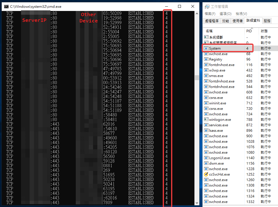 所有連入伺服器的資訊,果然都是由 Process Id 4 的 System 所負責 😀