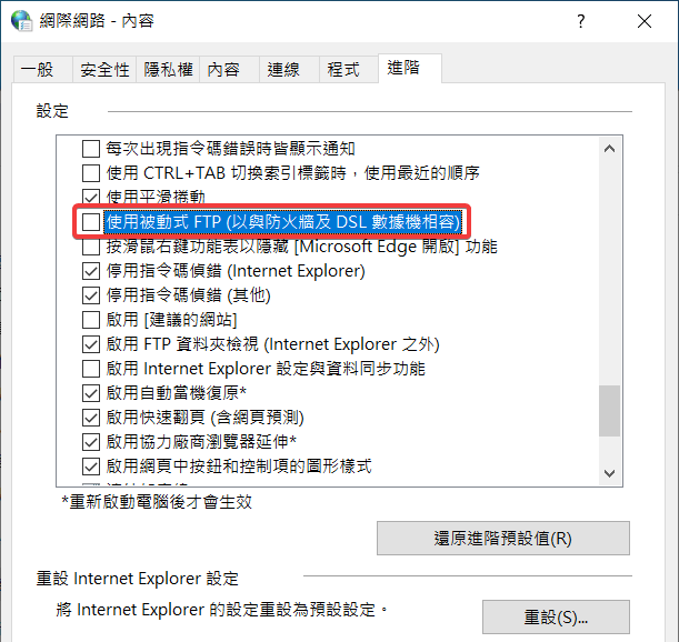 設定完成後,可能會發生連線逾時的情況,可以藉由 Windows Run inetcpl.cpl 來關閉 Passive FTP 「使用被動式 FTP」以正常連線。