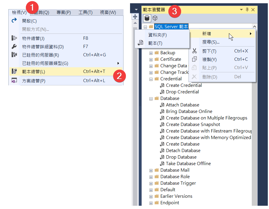 SQL Server Management Studio 內建的範本瀏覽器,包含許多常見的資料庫開發與維護工作所需要使用的 T-SQL,例如新增資料庫或者是新增函式,此外也可以在範本瀏覽器中加入自行設計的範本。當需要範本時,不用額外再查詢或開啟 .sql 檔案,非常方便。
