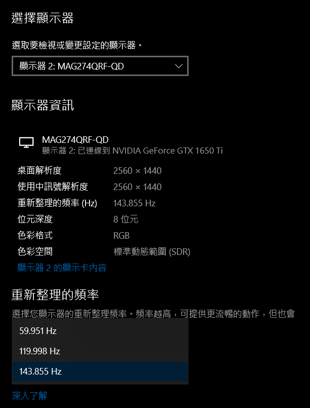 最近因為更新了設備,明明是可以支援 165Hz 更新頻率的螢幕,但在 Windows 10 的顯示設定卻無法調整,只支援到 60Hz,經過一番搜尋,終於找到原因 🙂
