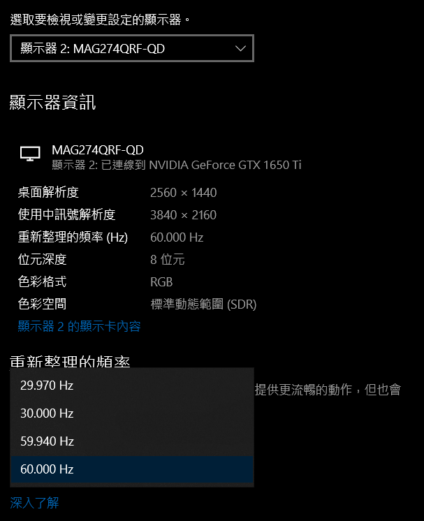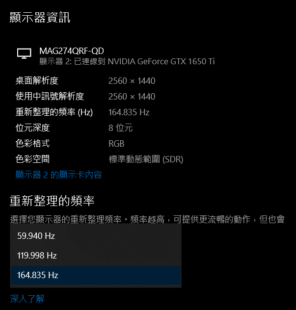 一開始在成功安裝螢幕後,準備來確認螢幕的更新頻率 (Refresh Rate),但找來找去卻發現只能設定到 60Hz,但螢幕設備明明可以支援到 165Hz。