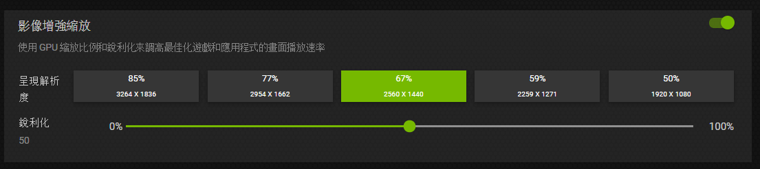 後來檢查 Nvidia GeForce Experience 想到之前有因為作業性能關係,啟用 「影像增強縮放」 (Image Scaling),這個功能藉由降低應用程式解析度的方式,達到呈現的效能增加 (但不會改變作業系統解析度),十分方便。