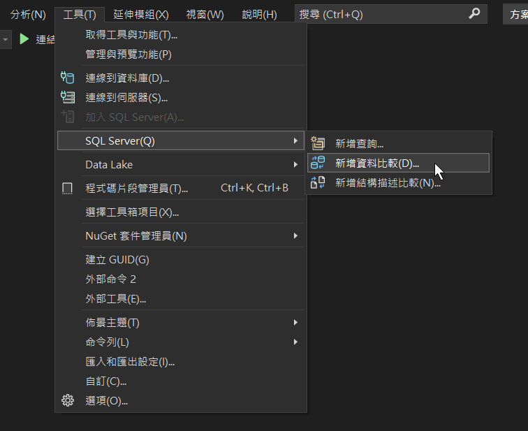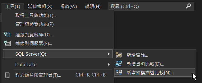好在 Visual Studio SSDT 提供了資料庫 Schema 比較的功能,首先由 Visual Studio 的頁籤依序選擇 工具、SQL Server 以及 新增結構描述比較