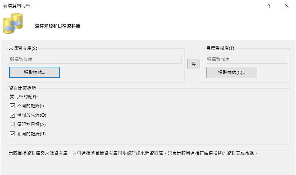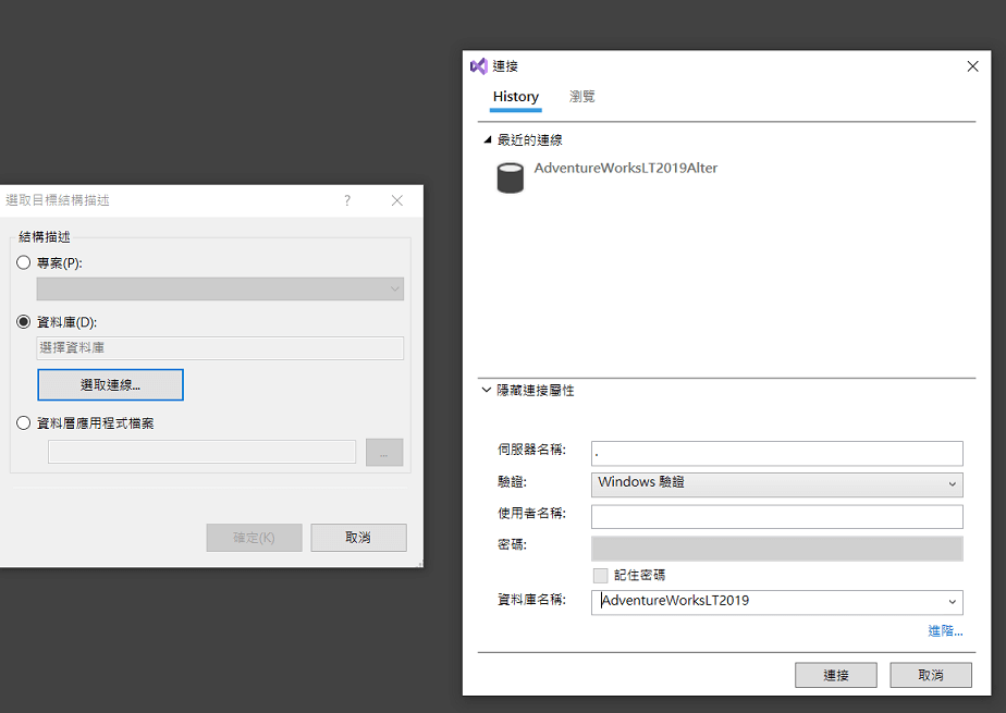 接著分別對來源資料庫 (開發環境的資料庫,最新的資料庫異動情形) 與目標資料庫 (正式環境的資料庫,尚未同步開發環境的資料庫異動) 進行連線設定。本次操作為簡化環境,都是使用 sysadmin 的身分對兩個資料庫進行連線,但實務上可以由開發人員將開發資料庫與正式資料庫 (只將 Schema 還原到開發環境) 進行比較,再將 Alter Script 提供給資料庫管理人員進行異動。