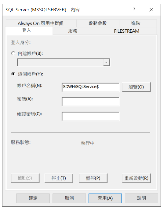 本次示範首先建立 Group Managed Service Accounts SQLService,提供 SQL1 (Primary Server) 以及 SQL2 (Primary Server) 的 SQL Server Service 以及 SQL Server Agent Service 作為 Identity。