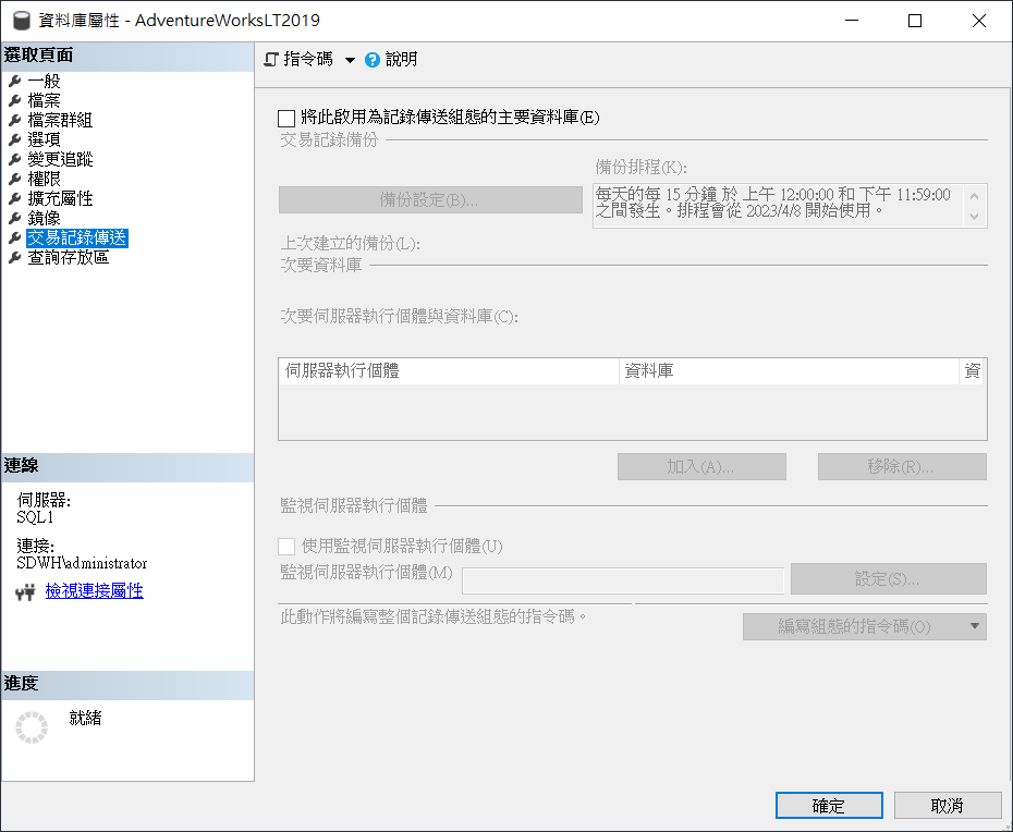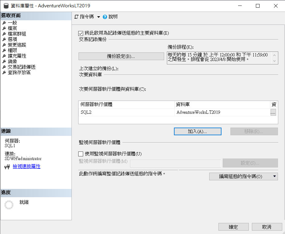 首先啟用交易紀錄傳送,在啟動前必須先進行該資料庫的完整備份。