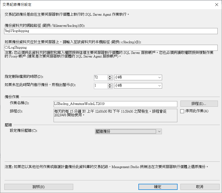 啟用 Log Shipping 會需要保存交易紀錄,可以搭配備份壓縮來減少所產生的資料量。
